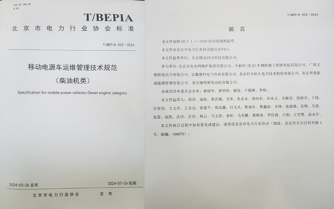 2024年7月26日,《移动电源车运维管理技术规范(柴油机类)标准号:T/BEPIA 002-2024》正式发布实施,该标准由北京市电力行业协会提出,北京联众同力科技有限公司牵头,北京京电电网维护集团有限公司、广西玉柴船电动力有限公司、安徽JIUYOU.COM九游电气科技有限公司等单位参与起草制订。